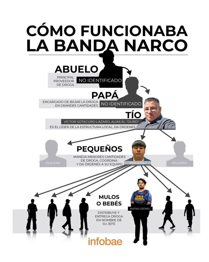 Después de abuelo, papá y tío vienen los “pequeños”, la siguiente jerarquía. Este era el rol asignado a “Pequeño J”, mencionado por Celeste en su declaración como Julio. Su función central era manejar cantidades menores de droga, entre 7 y 10 kilogramos, controlar distintos puntos de venta y gestionar un grupo de vendedores de nivel bajo, llamados “bebés” o “mulos”.