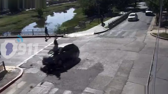 Las imágenes de las cámaras de seguridad del 911 muestran el instante del accidente: tres menores –una niña y dos niños– cruzan la calle. El primero logra esquivar el peligro, el segundo sufre el impacto de la moto y la tercera se detiene a tiempo antes de cruzar.