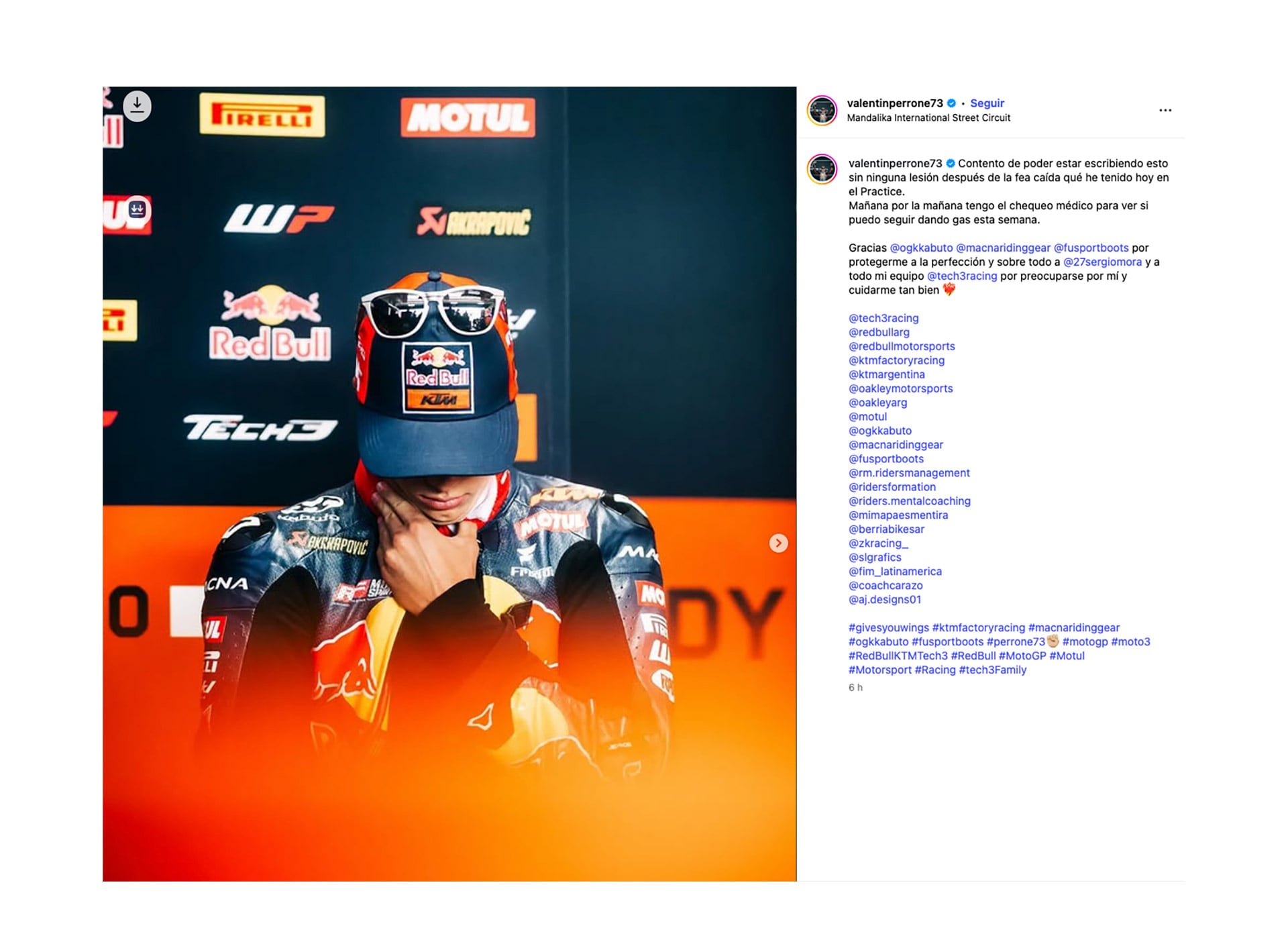 “Valentín Perrone está consciente tras su grave caída durante los entrenamientos del Gran Premio de Indonesia. Tras un primer reconocimiento en el centro médico del circuito, ahora será trasladado al hospital local para someterse a más pruebas. Más adelante ofreceremos más información al respecto”, fue el primer comunicado de la escudería.