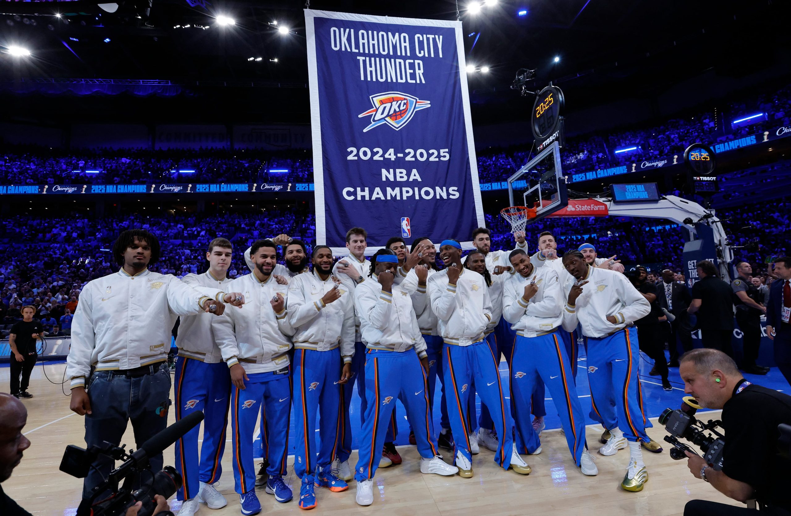 Los jugadores de Oklahoma City Thunder recibieron el anillo de campeones de la NBA en el comienzo de la nueva temporada (Alonzo Adams-Imagn Images)