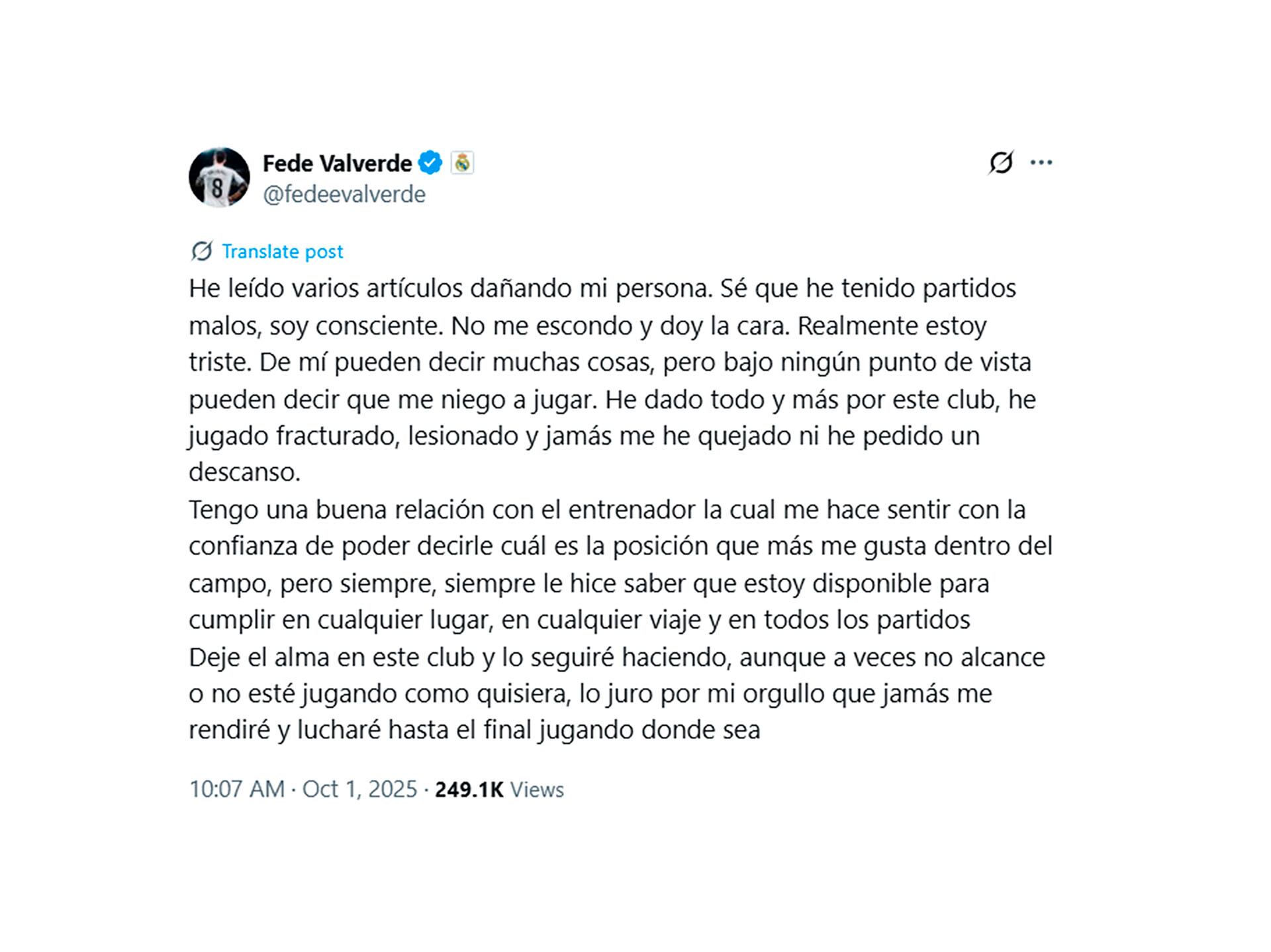 A pesar de los cuestionamientos sobre su uso fuera de posición, Valverde fue enfático respecto a su disposición para ayudar al equipo donde sea requerido: “Si lo digo, pueden tomarme de mentiroso. Pregunten al entrenador, siempre he dicho que estoy a disposición del equipo. Nunca me he negado a jugar en ninguna posición, siempre doy lo mejor de mí en cualquier sitio. Con Ancelotti, con Zidane y con Xabi. Siempre di mi opinión, el que juega de titular tiene que abrazar esa oportunidad como si fuese la última. Nunca me negué, es raro que salga algo así. Es un privilegio jugar en el Madrid, lo dejo claro. Pueden preguntar a otros compañeros o al entrenador. Siempre estoy para el equipo y siempre voy a morir por el Real Madrid”, subrayó el uruguayo.