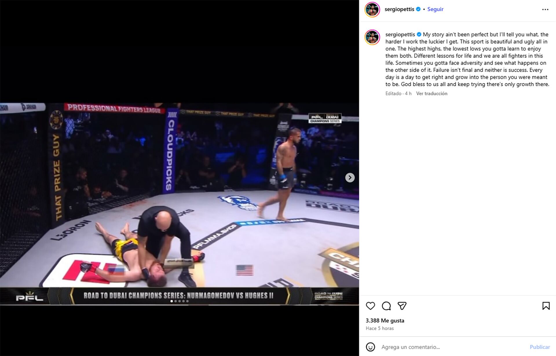 Tras el combate, Pettis festejó su victoria con un largo posteo en sus redes sociales. “Mi historia no ha sido perfecta, pero te diré que, cuanto más duro trabajo, más suerte tengo. Este deporte es hermoso y feo todo en uno. Los máximos más altos, los más bajos tienes que aprender a disfrutar de ambos. Diferentes lecciones para la vida y todos somos luchadores en esta vida”, comenzó.