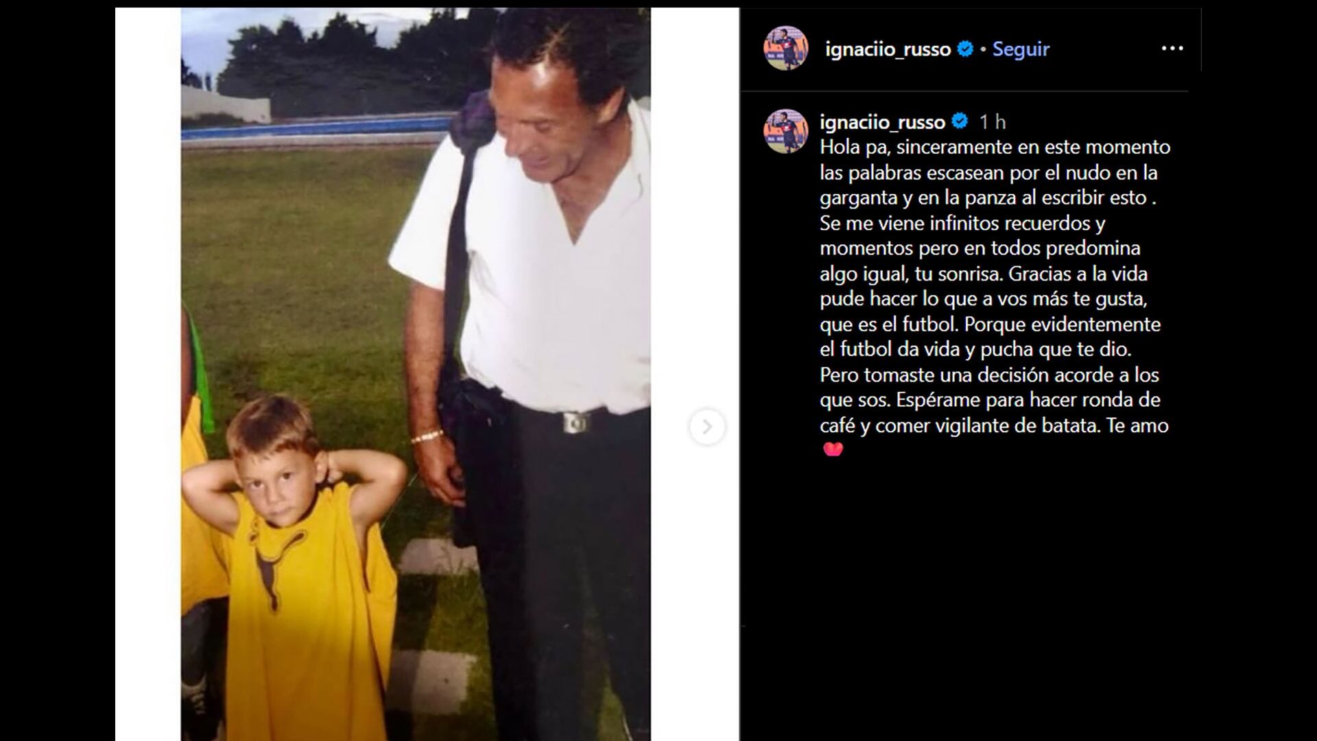 También compartió otro posteo con varias imágenes suyas de niño y adolescente junto a su padre, y un mensaje cargado de emoción: “Hola pa, sinceramente en este momento las palabras escasean por el nudo en la garganta y en la panza al escribir esto. Se me viene infinitos recuerdos y momentos pero en todos predomina algo igual, tu sonrisa. Gracias a la vida pude hacer lo que a vos más te gusta, que es el fútbol. Porque evidentemente el fútbol da vida y pucha que te dio. Pero tomaste una decisión acorde a los que sos. Espérame para hacer ronda de café y comer vigilante de batata. Te amo “.