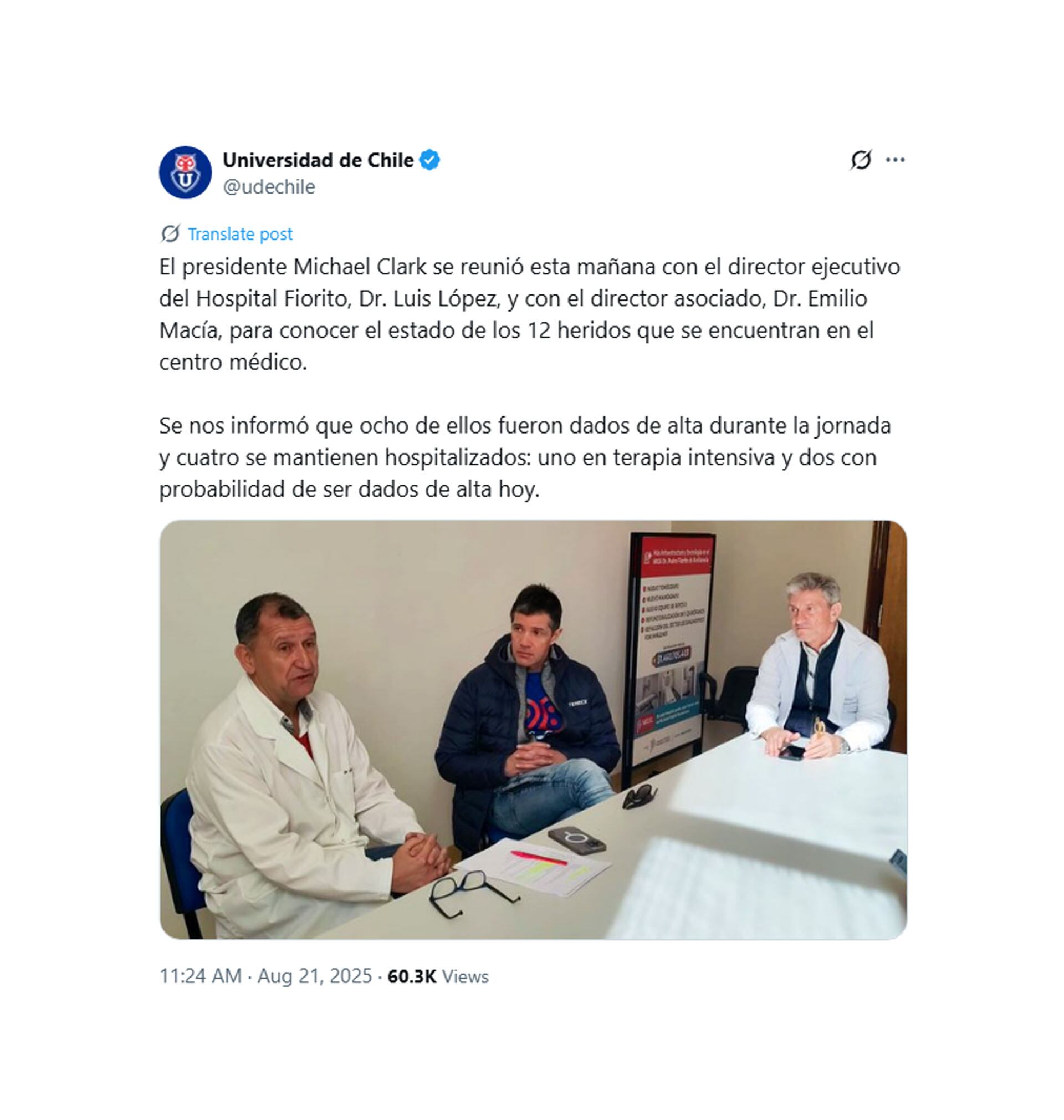Clark visitó a los internados en el Hospital Fiorito y llevó tranquilidad a los familiares de los heridos más graves. “Vienen evolucionando bien. Le van a dar de alta la semana que viene. De las 12 personas van quedando cuatro internadas y, seguro, al final del día, quedarán dos. Tenemos que estar muy contentos”, afirmó el pope de la U, según recogieron medios chilenos como Emol y Bío Bío.