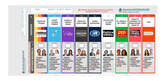 Al ingresar al cuarto oscuro, el ciudadano recibirá una sola hoja, la BUP, donde estarán impresas y ordenadas todas las listas oficializadas de candidatos a diputados nacionales que compiten en Tucumán. En dicha boleta se encuentran expuestos el nombre de cada partido o alianza, los principales postulantes y los símbolos que identifican visualmente a cada fuerza.