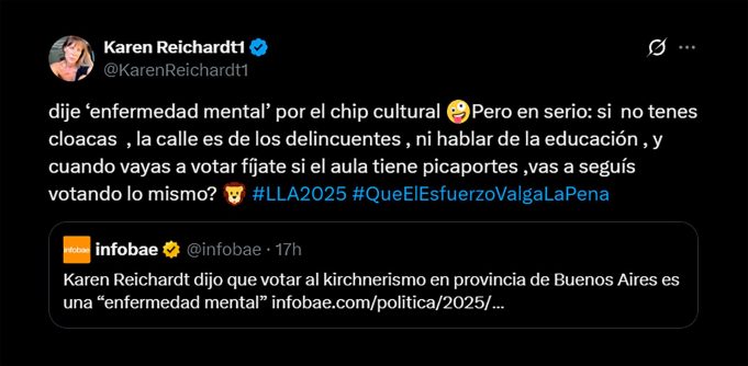 Lejos de buscar bajarle el tono a sus dichos, o directamente dejar pasar sus repercusiones en silencio, este viernes Karen Reichardt redobló la apuesta tras haber asegurado que quienes votan al kirchnerismo en la provincia de Buenos Aires son “enfermos mentales”. En una publicación en sus redes sociales, la candidata libertaria se refirió a un “chip cultural” y se preguntó por qué esas personas siguen eligiendo al peronismo.