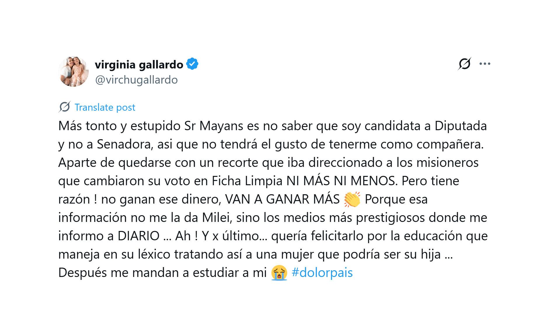 Sin mencionarlo, Mayans hizo referencia a un recorte de archivo que circuló en redes sociales, donde Virginia Gallardo afirmaba con sorna en la mesa de Mirtha Legrand que ganando nueve millones de pesos por mes la vida de un senador es sencilla. “Así yo también lo sería”, había deslizado con sarcasmo la actríz. Con la confirmación de su candidatura en el oficialismo de cara a las elecciones de octubre aquel recorte cobró actualidad y volvió a ser objeto de comentarios en las redes sociales.