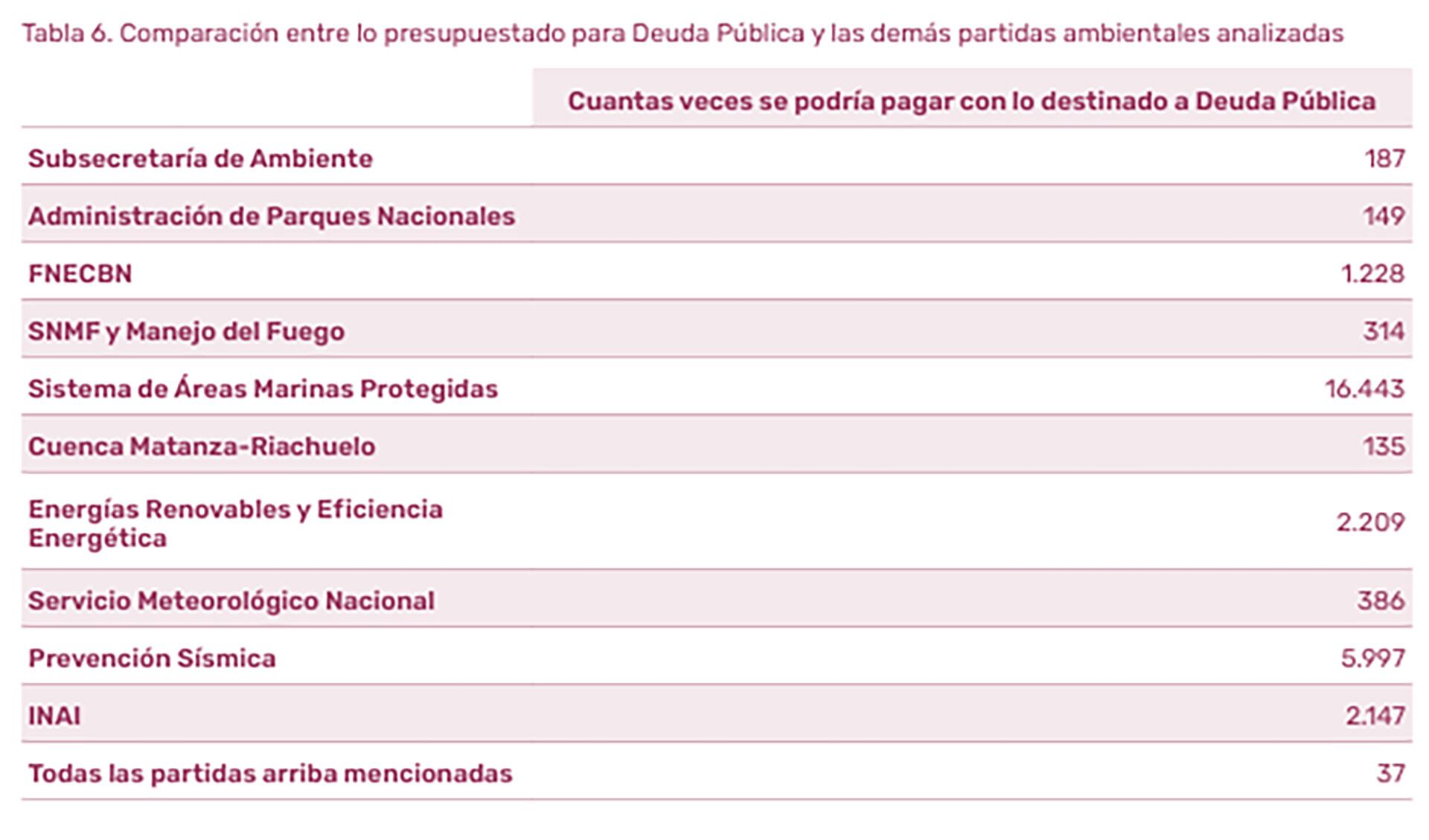 El presupuesto destinado a la deuda pública durante 2025 podría financiar 37 veces el total de las partidas ambientales. Y si el Gobierno así lo estableciera, la mayoría de este tipo de áreas podrían ser cubiertas con una pequeña parte del superávit fiscal, lo que pondría fin al ajuste en los principales organismos de protección ambiental en el país.