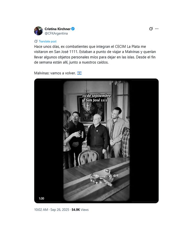 Y, además, en el video que acompañó la publicación, hubo un pedido especial de los exsoldados: “¿Que te gustaría decirle a la gente desde Malvinas, ¿qué le dirías vos? “Que vamos a volver”, no dudó en decir la expresidenta.